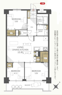 | 間取り詳細 | LDK12.8帖 洋室5.9帖WIC付き 洋室5.6帖 洋室4.1帖 | 構造 | 鉄骨鉄筋コンクリート造 |