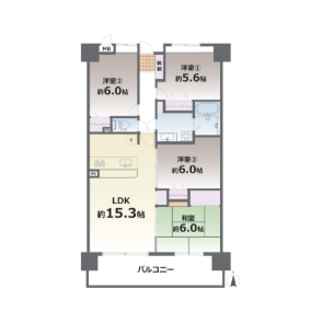 | 間取り詳細 | LDK約15.3帖 洋室約6.0帖 洋室約6.0帖 洋室約5.6帖 和室約6.0帖 | 構造 | 鉄筋コンクリート造 |